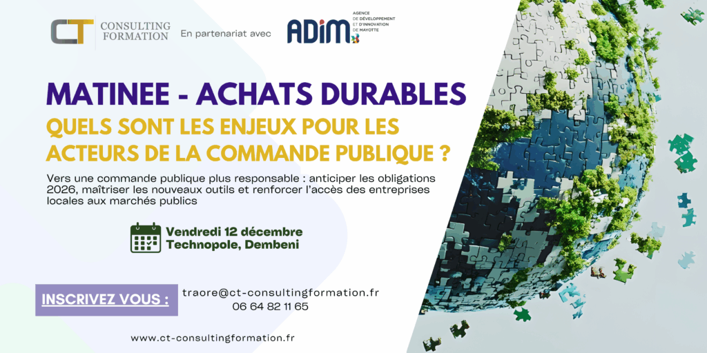 Dans ce contexte d’évolution majeure de la commande publique, CT Consulting & Formation, en partenariat avec l’ADIM – Agence de Développement et d’Innovation de Mayotte, organise une matinée d’information et d’échanges dédiée à l’achat durable. Cette initiative s’inscrit dans la continuité du Mayotte Acteur de son Développement 2025 (MAD 2025), notamment des actions engagées sur les biodéchets, l’économie sociale et solidaire (ESS).